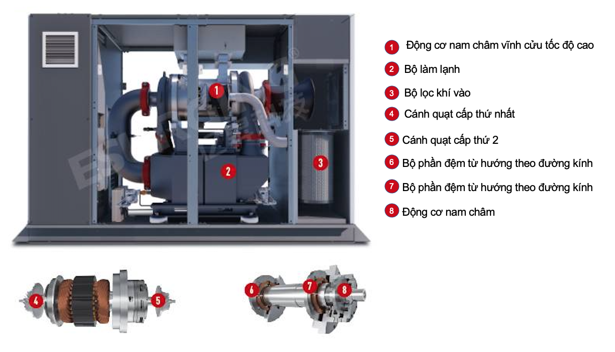 Khi hoạt động, rotor máy hoàn toàn treo, không có ma sát, giảm thiểu mất mát cơ học, giúp tiết kiệm hơn 20% năng lượng so với máy nén khí truyền thống.